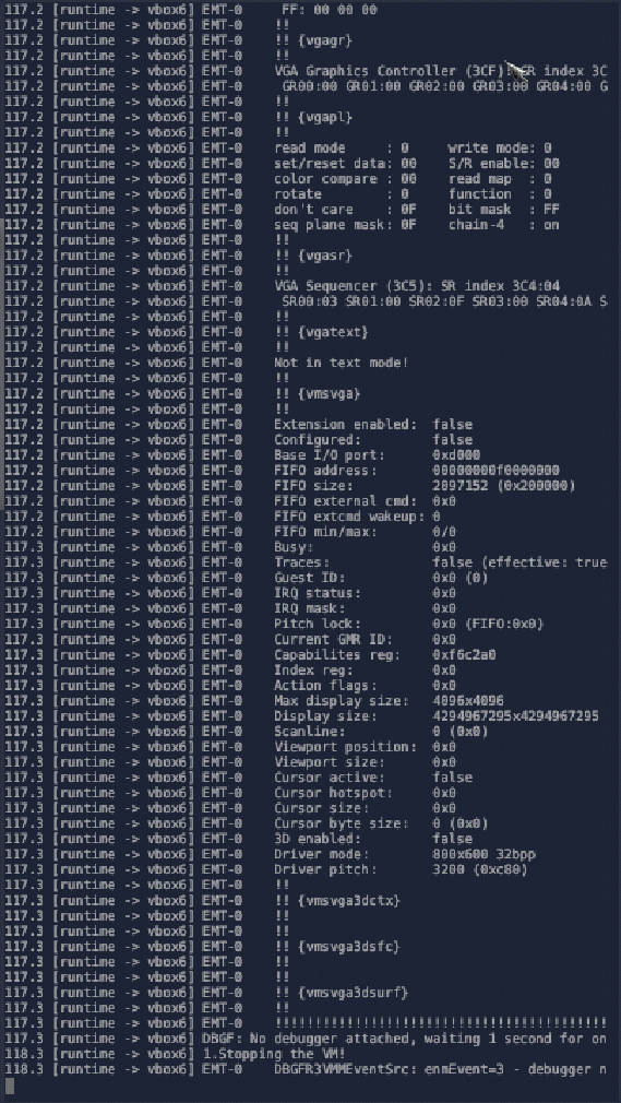 I then tried the vbox6 archive from the Genodelabs, however the logs indicated an error. I then tried with cnuke's vbox6 archive. I do not see an error in the logs, however the virtual machine is still not starting in my wm component. There do seem to be some warnings regarding bogus values for '/shared' and '//machin...' (see screenshot).